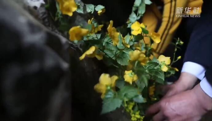 ↑4月2日,曾祥有在金剛臺“紅軍洞”里獻(xiàn)花祭奠。新華社記者郝源攝