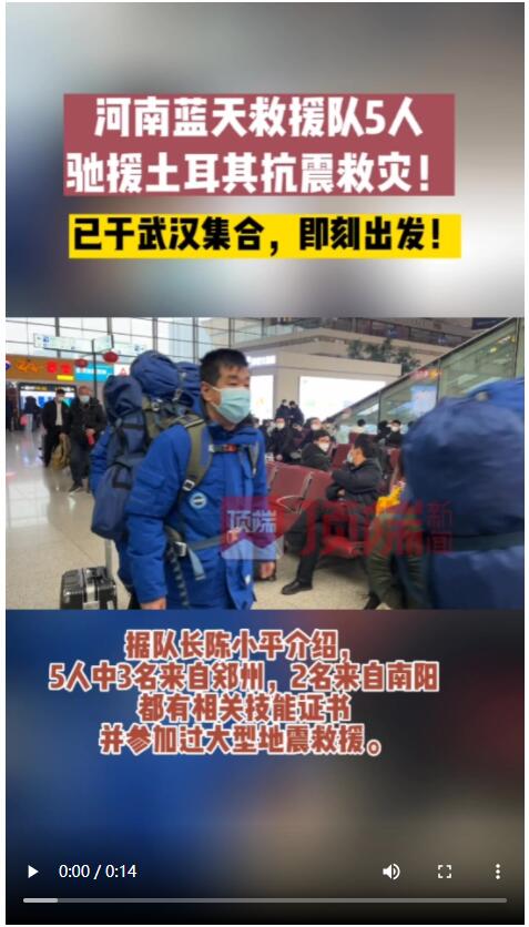 2月8日,河南藍(lán)天救援隊(duì)派出5名隊(duì)員奔赴武漢,與藍(lán)天救援隊(duì)總隊(duì)隊(duì)員會(huì)合,馳援土耳其抗震救災(zāi)。目前,這5名隊(duì)員已經(jīng)陸續(xù)到達(dá)武漢天河機(jī)場。按照原定計(jì)劃,他們將乘坐下午3點(diǎn)35分的航班飛往伊斯坦布爾,但因?yàn)橥炼洚?dāng)?shù)靥鞖庠,今日武漢飛往土耳其的航班推遲至下午6點(diǎn)起飛。