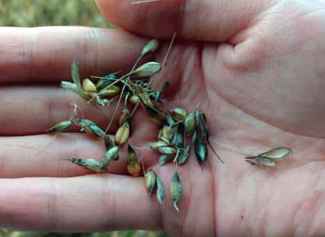 29日當(dāng)天,洛陽多地再次降雨。頂端新聞?dòng)浾咴诼尻柌糠挚h區(qū)走訪時(shí)發(fā)現(xiàn),不少麥地整體呈現(xiàn)黃色的麥稈上還帶有些許黃綠色的葉片;麥穗上存在發(fā)黑的情況;用手搓開麥穗,存在部分麥子發(fā)芽的情況。