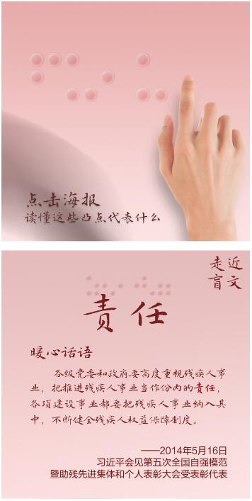摘要: 習(xí)近平總書記格外關(guān)心、格外關(guān)注殘疾人群體,諄諄囑托和殷殷期許,溫暖而又鼓舞人心。讓我們通過一組特殊的“文字”和“語言”,走近殘疾人朋友,讀懂總書記的深切關(guān)愛。 轉(zhuǎn)發(fā)這張愛心