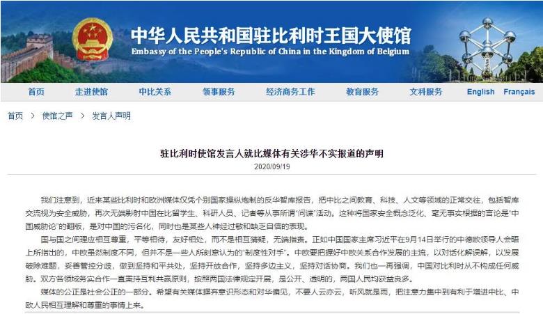 19日,駐比利時使館發(fā)言人就比媒體有關涉華不實報道的聲明。聲明如下: