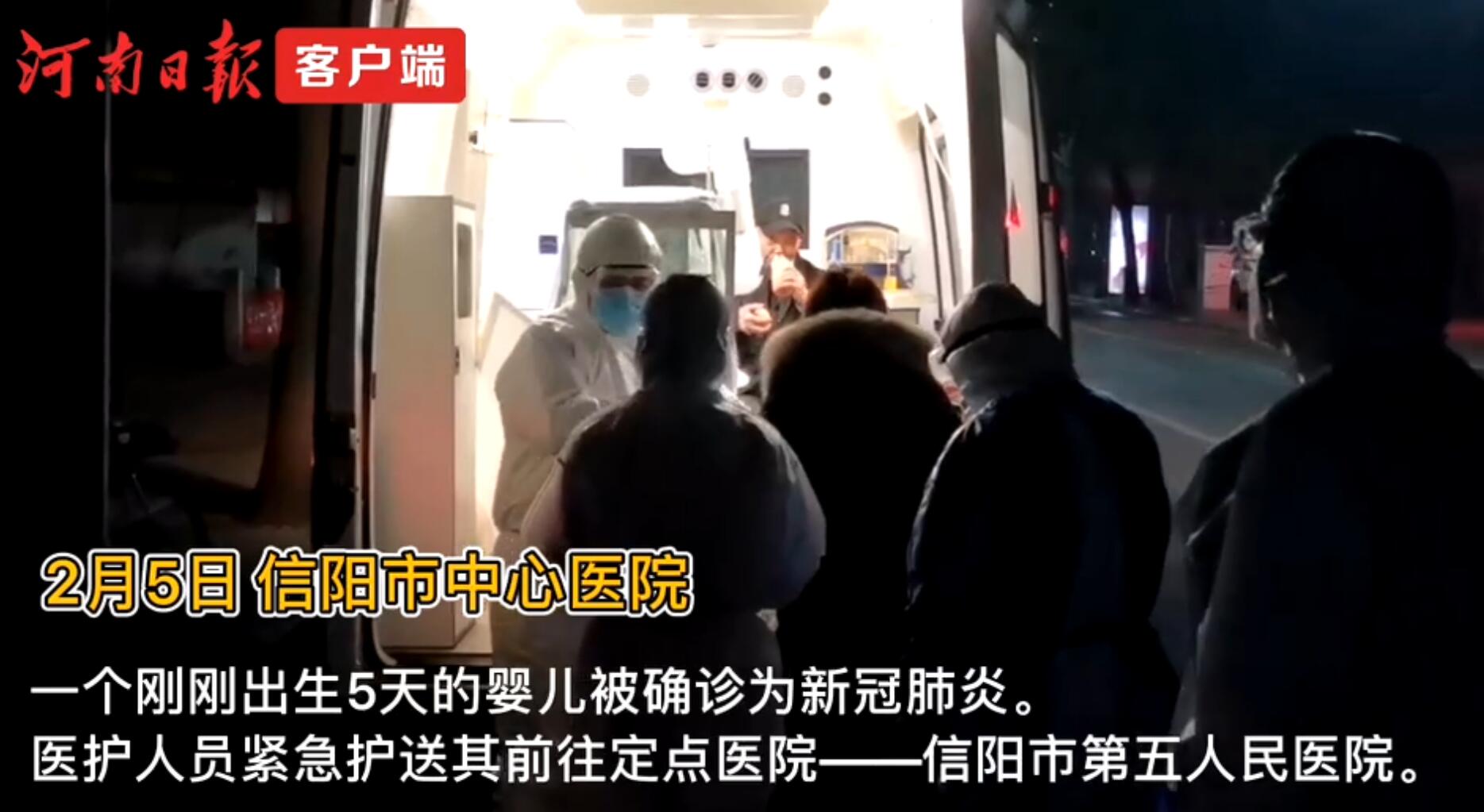 2月5日19時(shí)20分許,信陽(yáng)市中心醫(yī)院發(fā)熱門診外,急救車的藍(lán)燈閃爍,寒風(fēng)中,為了一個(gè)剛剛出生5天的被感染嬰兒,一群醫(yī)護(hù)人員等在路邊。與這個(gè)寶寶一起跟著急救車離去的,還有3位新生嬰兒科的醫(yī)生和護(hù)士,他們將一起進(jìn)入信陽(yáng)市新型冠狀病毒感染的肺炎收治定點(diǎn)醫(yī)院——信陽(yáng)市第五人民醫(yī)院。