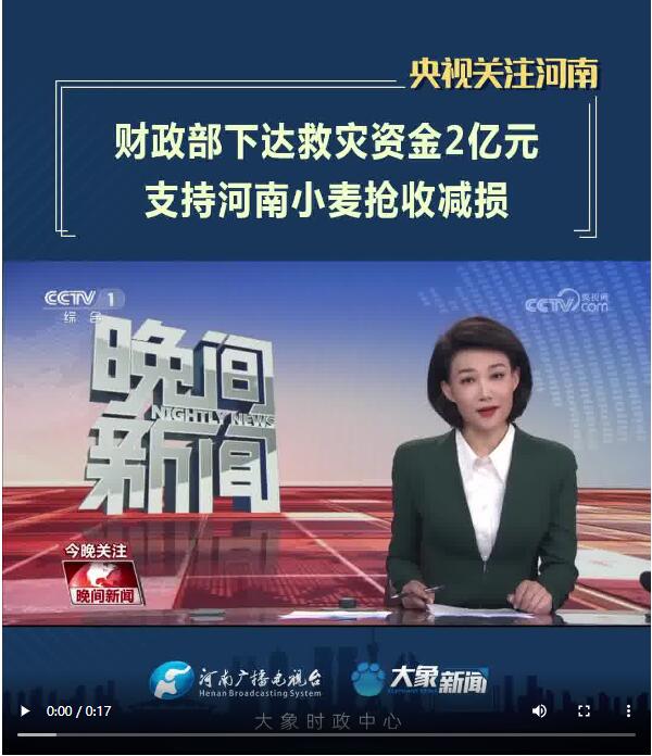 【央視關(guān)注河南】財(cái)政部下達(dá)救災(zāi)資金2億元 支持河南小麥搶收減損
