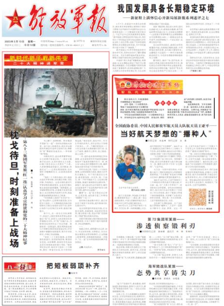開欄的話 推開春的大門,生機勃勃的中國即將進入“兩會時間”。 去年,黨的二十大勝利召開,擘畫了全面建設(shè)社會主義現(xiàn)代化國家、以中國式現(xiàn)代化全面推進中華民族偉大復興的宏偉藍圖,吹響了奮進新征程的時代號角。 今年是全面貫徹落實黨的二十大精神的開局之年。開局決定全局,起步?jīng)Q定后程。春光正好,我們意氣風發(fā)踏上新征程,向著目標加速奔跑。 這是新的出發(fā)。今年全國兩會,新一屆全國人大代表、政協(xié)委員將齊聚北京、共商國是。自即日起,解放軍報推出“昂揚奮進強軍路·軍隊代表委員風采錄”專欄,展現(xiàn)新時代軍隊人大代表、政協(xié)委員履職盡責、擔當作為的新風采。